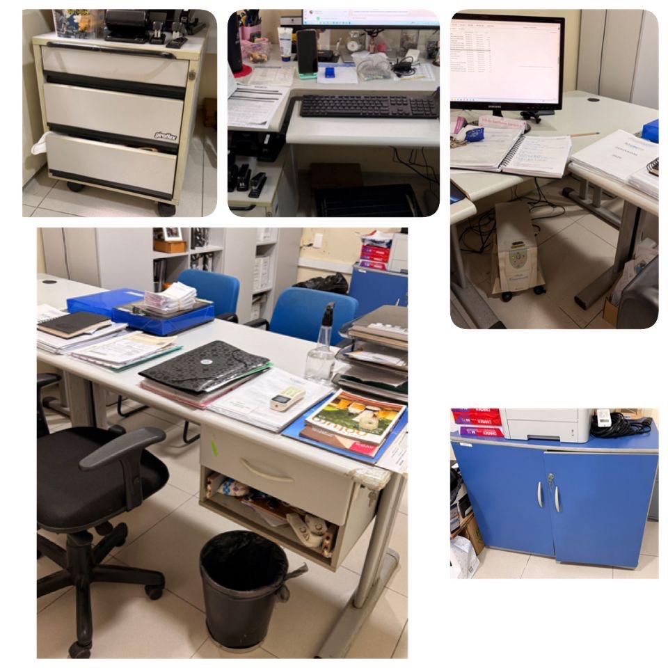 Mobílias diversas: 03 mesas, 01 gaveteiro, 01 balcão. Local: Sala da diretoria.