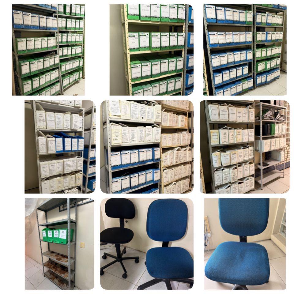 Mobílias diversas: 11 estantes, 02 cadeiras, 02 conexões de mesa. Local: garagem.