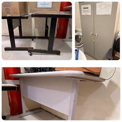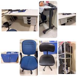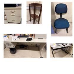 02 mesas, 01 gaveteiro, 01 mesinha, 01 cadeira. Local: sala da contabilidade e financeiro.