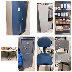 Mobílias diversas: 01 armário, 01 estante, 02 armários cinzas, 03 cadeiras azuis, 03 mesas. Local: Sala de cobrança.